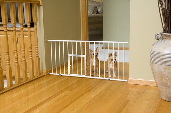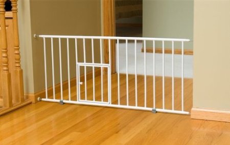 Expands from 29 to 32 inches wide. Or, add the included 6-inch extension and expand your gate to 38 inches wide. Can expand to desired width with additional extension panels (sold separately). Panels are available in 4″, 6″, 12″ or 24″ widths. Small pets pass through the patented 10-inch by 9-inch pet door while you comfortably step over the gate. Pressure mount system makes set-up quick and easy. All-steel construction is sturdy, durable, lead-free, non-toxic and chew-proof.