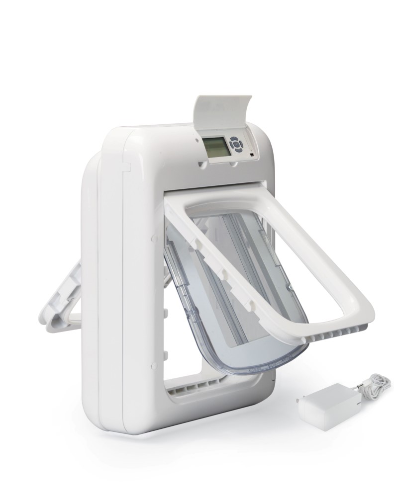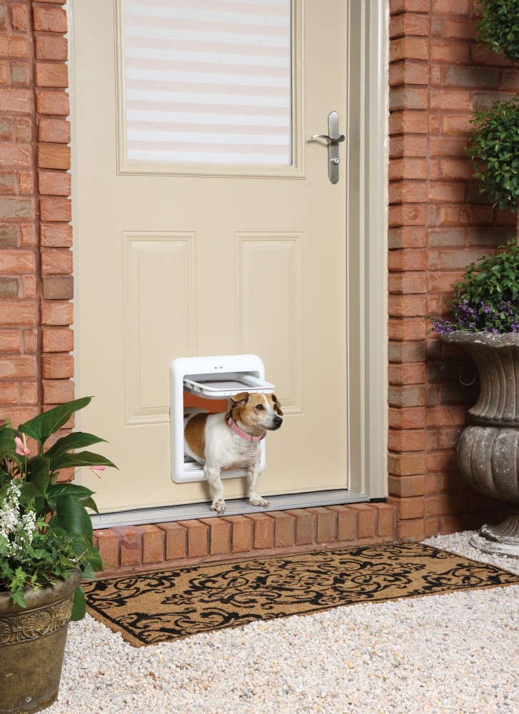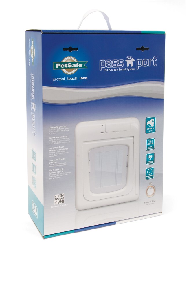 With its contemporary design and advanced entry and exit technology, the Passport Pet Access Smart System™ provides freedom and peace of mind like no other pet door. Using radio-frequency identification (RFID) technology, the Passport™ reads the Passport Key™ worn on your pet’s collar. This allows only pets with programmed IDs to enter and exit the home, while keeping out other pets, wild animals, and strays. Up to 20 keys can be programmed to your door and you can set an optional audible alert to let you know when pets are entering or exiting the door. Choose from advanced selective entry and exit by pet, multiple access options (such as in-only access and out-only access), and access only at specific times of the day. Programming is easy using the LCD screen and 5-button navigation or by connecting to your computer with the included USB cable. A wireless connection allows for convenient future remote programming from any smart device, even when you’re not at home (requires Passport Wireless Card). This Small door has a flap opening measuring 7 1/8 x 8 1/4 inches and is recommended for pets 1-25 pounds. Also available in a Medium option for larger pets. The Passport™ gives you complete control of each pet’s access.