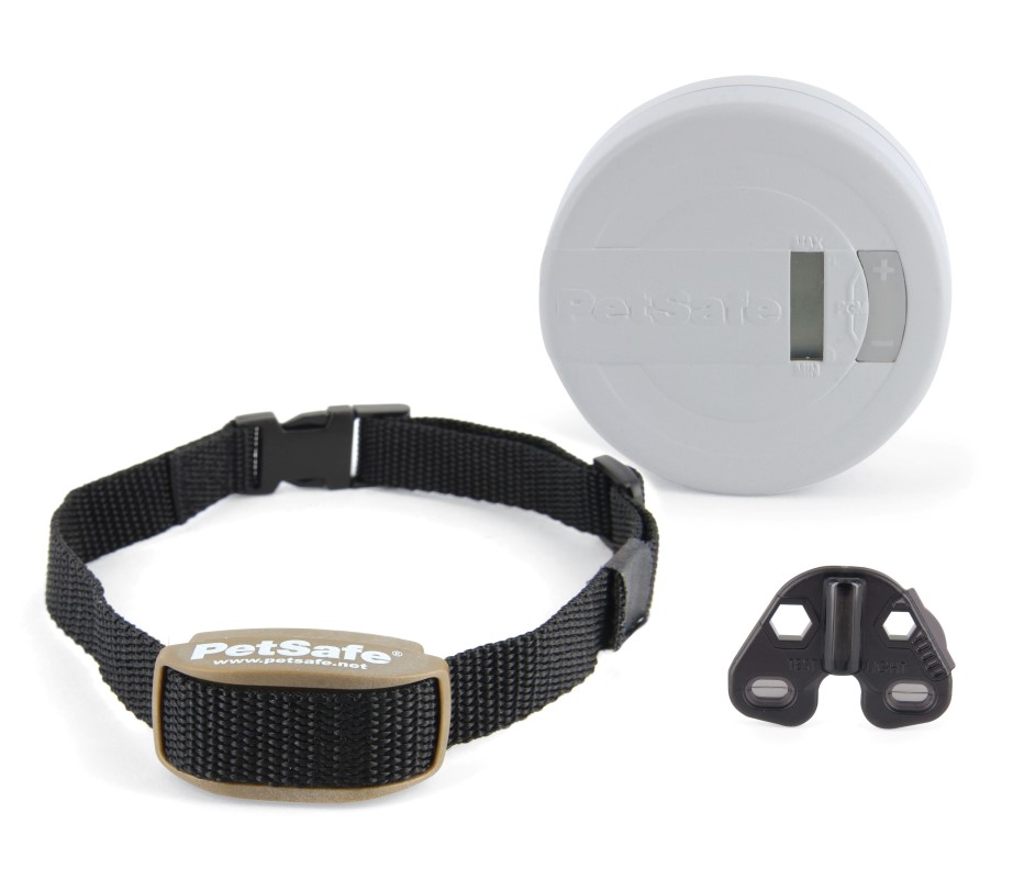 The transmitter sends an elliptical radio signal adjustable up to five feet. Your pet wears a Receiver Collar with Contact Points that touch his neck.