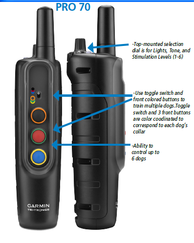 Classic, Rugged Design The PRO 70 uses the tried and true tube-shaped design that trainers have come to love, but is easy to operate (and master) 1-handed so you can keep your eyes on your dog at all times, even while switching between stimulation levels and dogs. The stimulation level/tone/LED selection dial is at the top of the handheld unit, allowing intuitive operation. And the multi-dog toggle switch and the color-coded buttons comfortably line up in the hand for fingertip control.