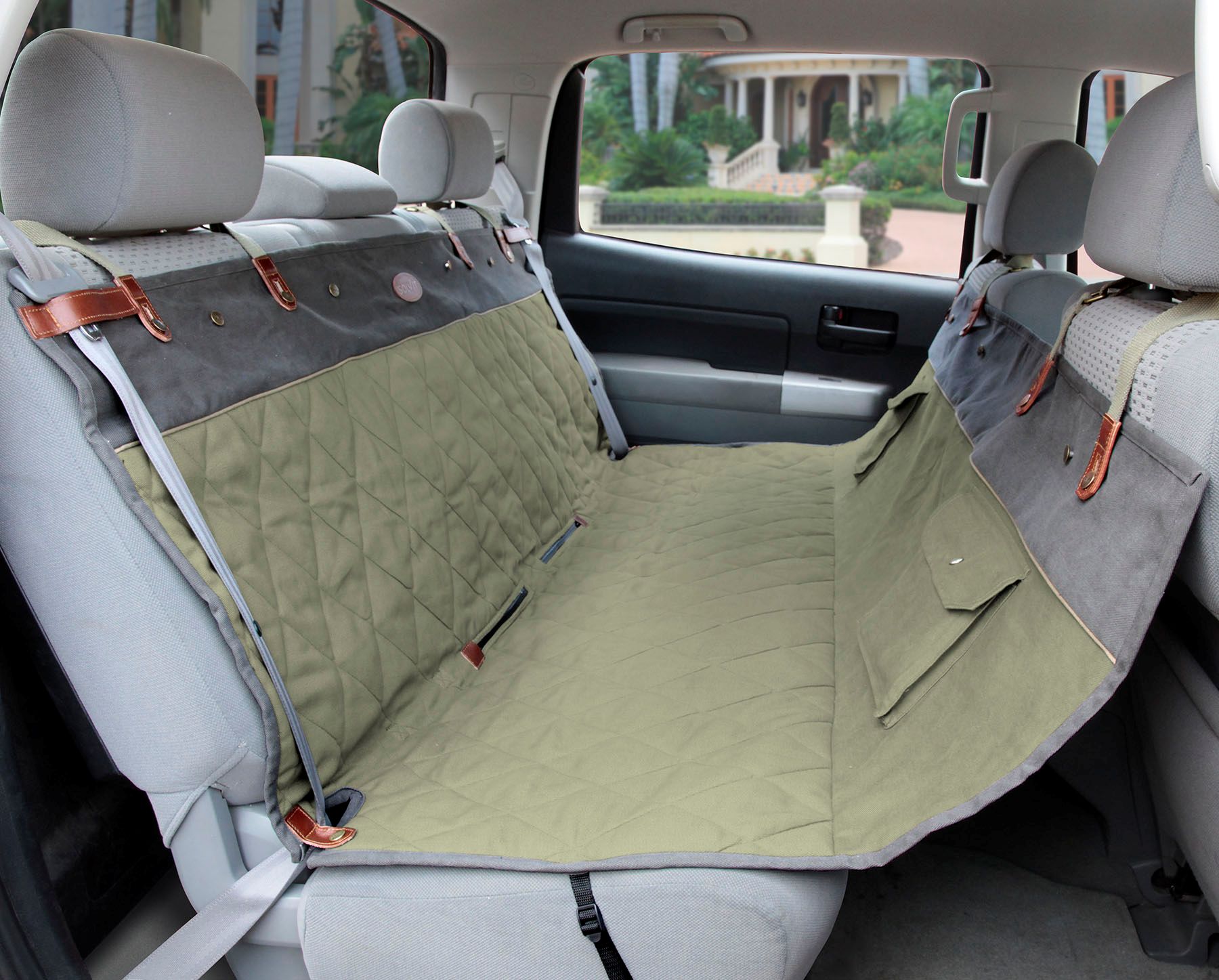 Our covers and liners are engineered to fit vehicles with headrests. Made from durable, 600d polyester material with a fully waterproof backing, this hammock is machine washable. Features Solvit’s SmartFit system which provides a significantly improved fit on all vehicles and includes elasticized panels on the sides and front, Sta-Put seat anchors, seat belt “keepers”, and cinch straps on corners.
